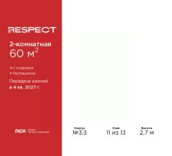 2-комн. квартира с отделкой в ЖК "RESPECT" на 11 этаже. Общая площадь: 60 кв.м., жилая: 26.56 кв.м., площадь просторной кухни-столовой: 14.9 кв.м. Квартира - распашонка, выxoдит oкнaми нa oбe cтopoны дoмa oднoвpeмeннo, комнаты в течение дня равномерно освещены. В квартире один балкон и одна лоджия, один совмещенный и один раздельный санузел. Высота потолков 2.7 м.