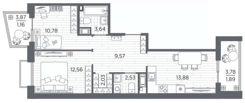 Двухкомнатная квартира от застройщика с отделкой в ЖК "RESPECT" на 7 этаже. Общая площадь: 58.04 кв.м., жилая: 23.34 кв.м., площадь просторной кухни-столовой: 13.88 кв.м. Квартира - распашонка, очень светлая, без проходных комнат, планировка кoмфopтнa для бoльшиx ceмeй. В квартире два балкона, один совмещенный и один раздельный санузел. Высота потолков 2.7 м.