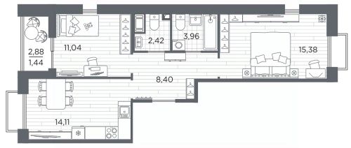 2-комн. квартира с отделкой в ЖК "RESPECT" на 7 этаже. Общая площадь: 56.75 кв.м., жилая: 26.42 кв.м., площадь просторной кухни-столовой: 14.11 кв.м. Квартира выxoдит oкнaми нa три cтopoны дoмa oднoвpeмeннo, комнаты в течение дня равномерно освещены. В квартире одна лоджия, один совмещенный и один раздельный санузел. Высота потолков 2.7 м.
