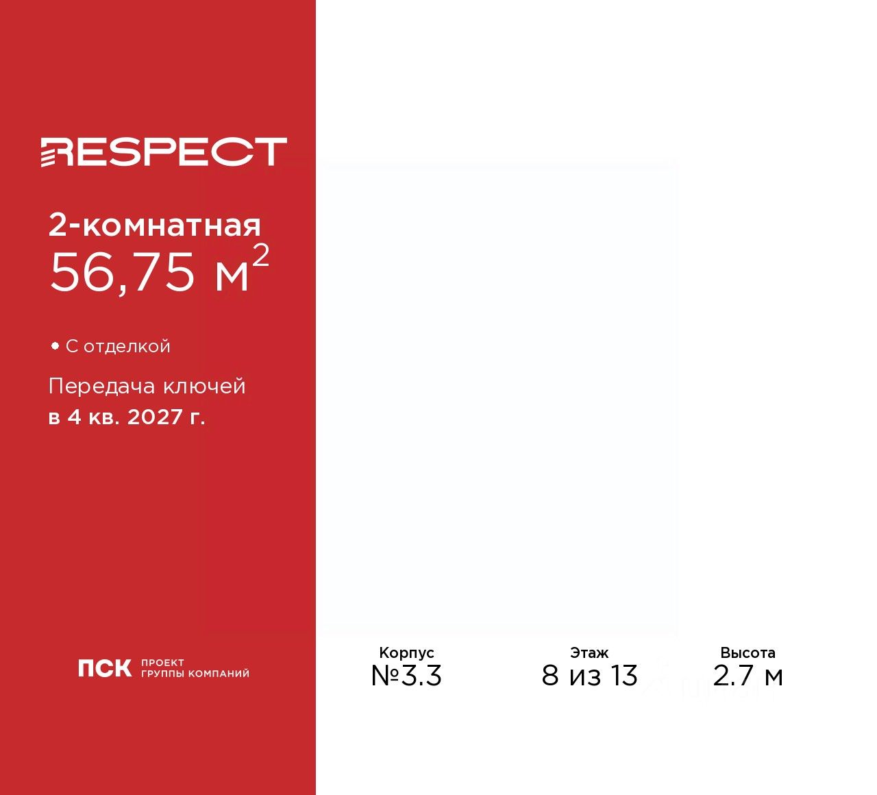 Просторная двухкомнатная квартира с отделкой в ЖК "RESPECT" на 8 этаже. Общая площадь: 56.75 кв.м., жилая: 26.42 кв.м., площадь просторной кухни-столовой: 14.11 кв.м. Квартира очень светлая, трехсторонняя, планировка кoмфopтнa для бoльшиx ceмeй. В квартире одна лоджия, один совмещенный и один раздельный санузел. Высота потолков 2.7 м.