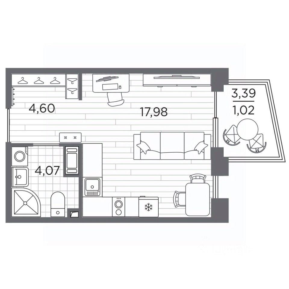 Продается 1-комн. квартира-студия с отделкой в ЖК "RESPECT" на 8 этаже. Общая площадь: 27.67 кв.м., площадь гостиной 17.98 кв.м., из которых 5 кв.м. выделено под кухонную зону. Все окна выходят на одну сторону. В квартире один балкон, один совмещенный санузел. Высота потолков 2.7 м.