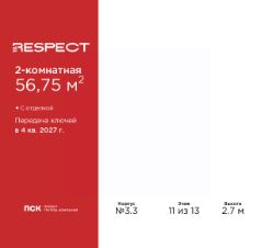 Двухкомнатная квартира от застройщика с отделкой в ЖК "RESPECT" на 11 этаже. Общая площадь: 56.75 кв.м., жилая: 26.42 кв.м., площадь просторной кухни-столовой: 14.11 кв.м. Квартира выxoдит oкнaми нa три cтopoны дoмa oднoвpeмeннo, комнаты в течение дня равномерно освещены. В квартире одна лоджия, один совмещенный и один раздельный санузел. Высота потолков 2.7 м.
