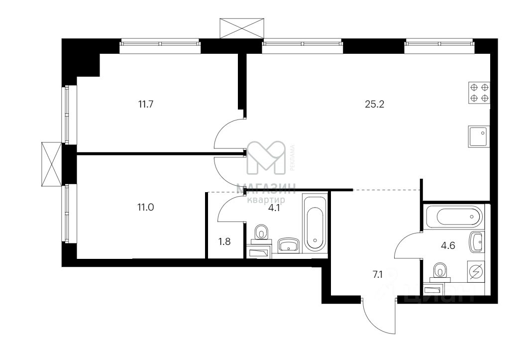 • Кухня-гостиная 25.2 м²-хватит пространства как для обеденной зоны, так и для зоны отдыха