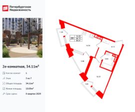 Удобная, классическая, функциональная европланировка, большая кухня-гостиная 14.34 м², просторная прихожая 6.12 м². Общая площадь квартиры - 34.11 м², жилая 10.05 м², высота потолка 3 м.