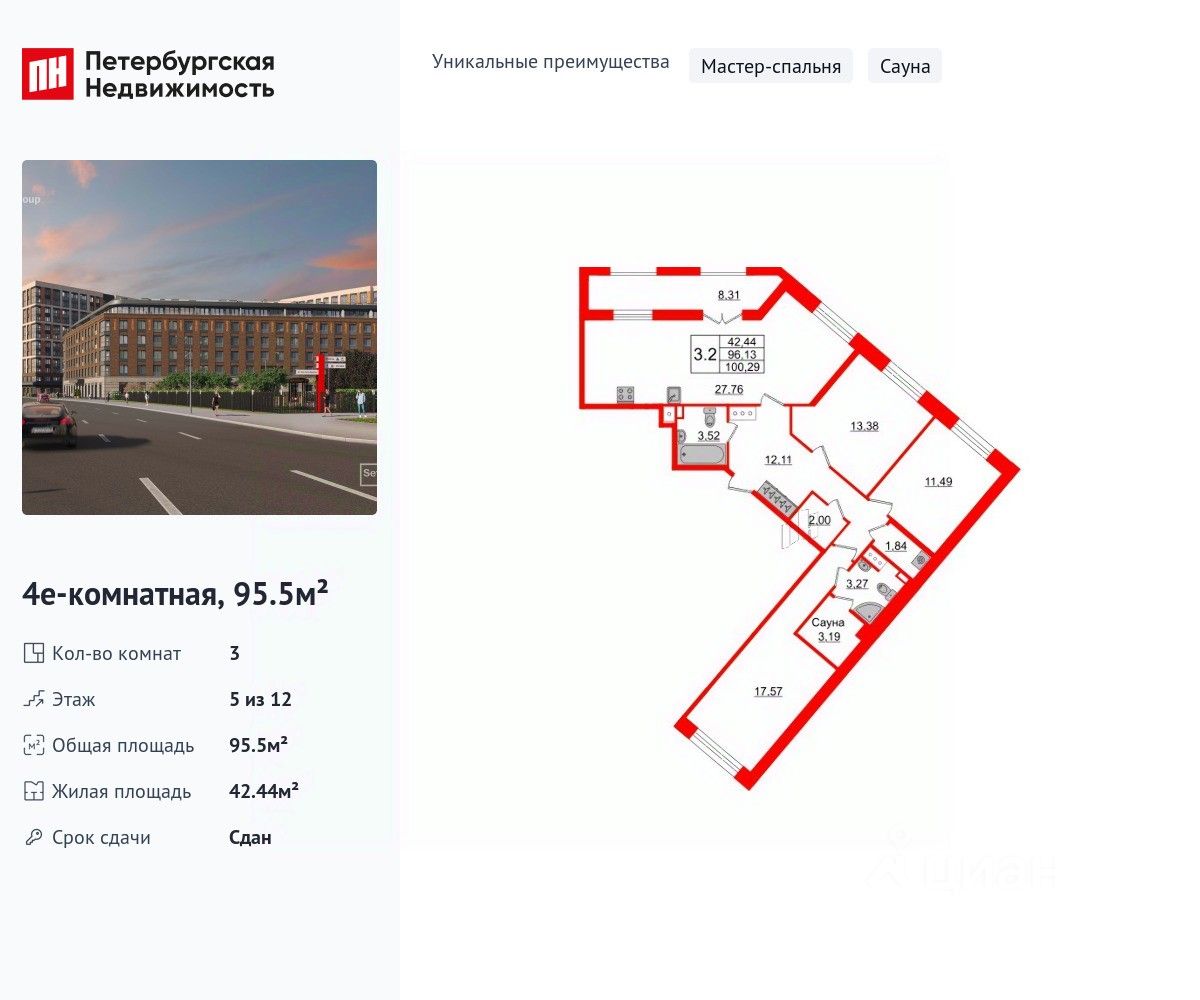 Уникальная, функциональная европланировка, большая кухня-гостиная 27.76 м², просторная прихожая 12.11 м². Общая площадь квартиры - 95.5 м², жилая 42.44 м², высота потолка 2.76 м.