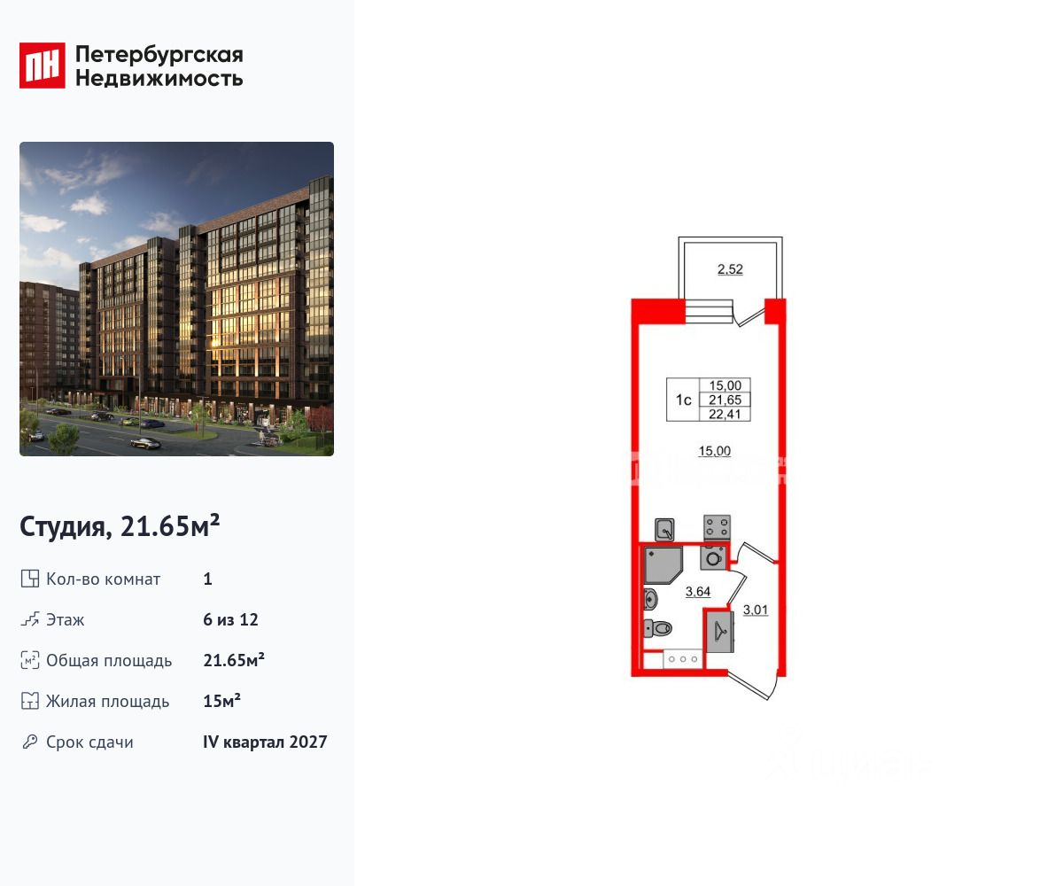 Удобная, классическая, функциональная европланировка, вместительная прихожая 3.01 м². Общая площадь студии - 21.65 м², жилая 15 м², высота потолка 2.75 м.