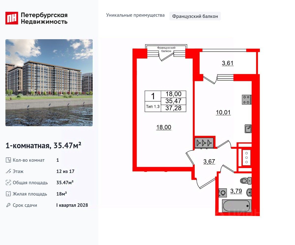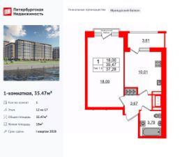 Уникальная планировка, кухня 10.01 м², вместительная прихожая 3.67 м². Общая площадь квартиры - 35.47 м², жилая 18 м², высота потолка 2.77 м.