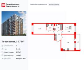 Уникальная, функциональная европланировка, большая кухня-гостиная 17.86 м², вместительная прихожая 5.05 м². Общая площадь квартиры - 55.78 м², жилая 24.84 м², высота потолка 2.77 м.