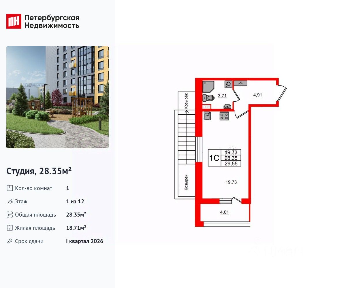Удобная, классическая, функциональная европланировка, просторная прихожая 5.18 м². Общая площадь студии - 28.35 м², жилая 18.71 м², высота потолка 2.77 м.