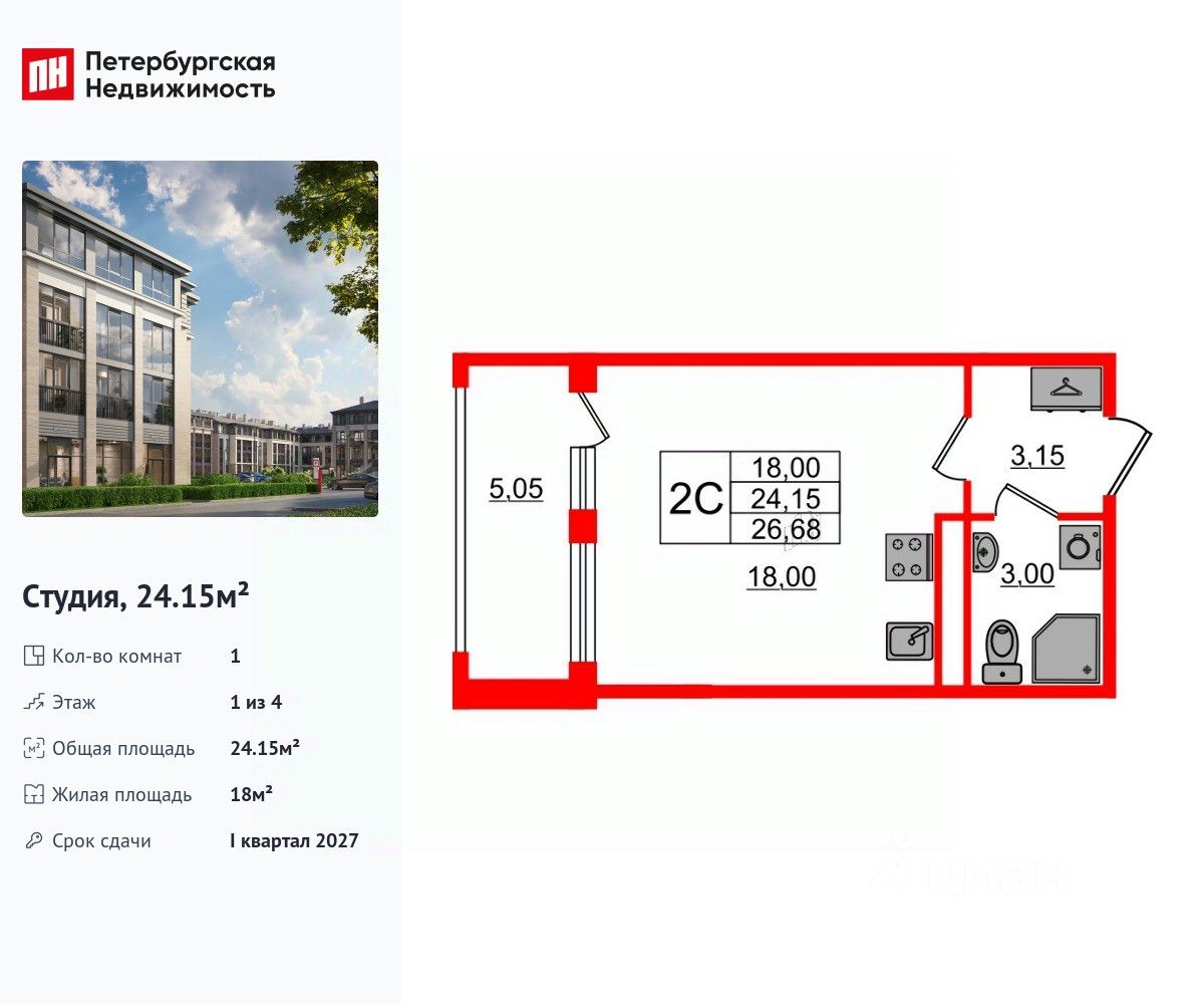 Удобная, классическая, функциональная европланировка, вместительная прихожая 3.15 м². Общая площадь студии - 24.15 м², жилая 18 м², высота потолка 2.75 м.
