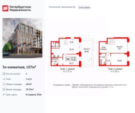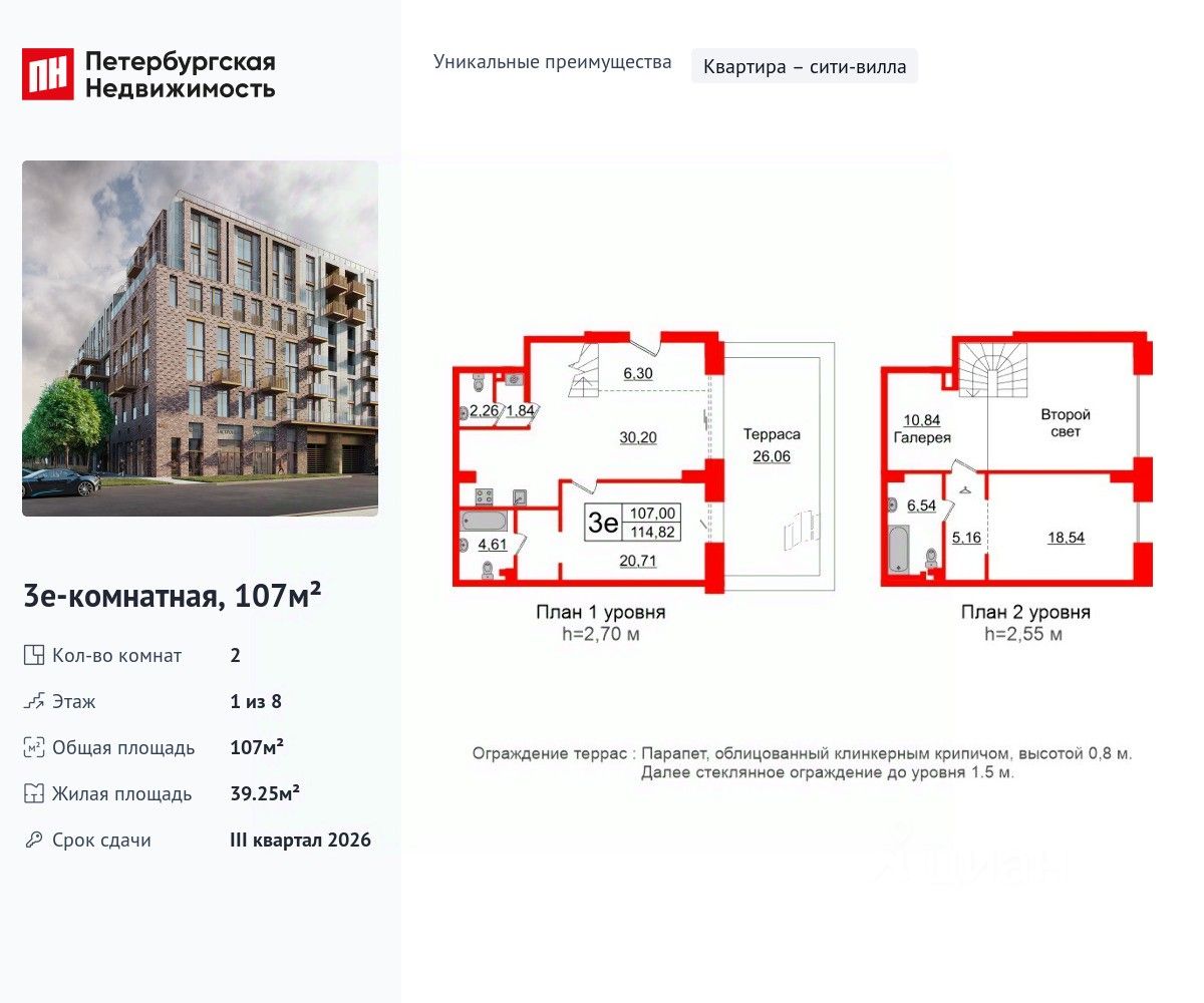 Уникальная, функциональная европланировка, большая кухня-гостиная 30.2 м², вместительная прихожая 6.3 м². Общая площадь апартаментов - 107 м², жилая 39.25 м².