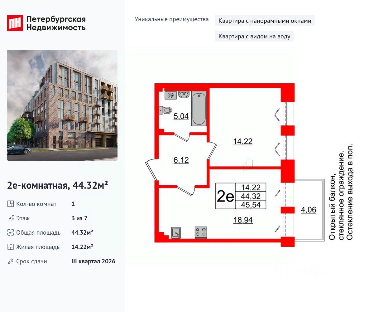 Уникальная, функциональная европланировка, большая кухня-гостиная 18.94 м², просторная прихожая 6.12 м². Общая площадь квартиры - 44.32 м², жилая 14.22 м², высота потолка 3 м.
