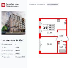 Уникальная, функциональная европланировка, большая кухня-гостиная 20.39 м², просторная прихожая 5.19 м². Общая площадь квартиры - 44.85 м², жилая 14.06 м², высота потолка 3 м.