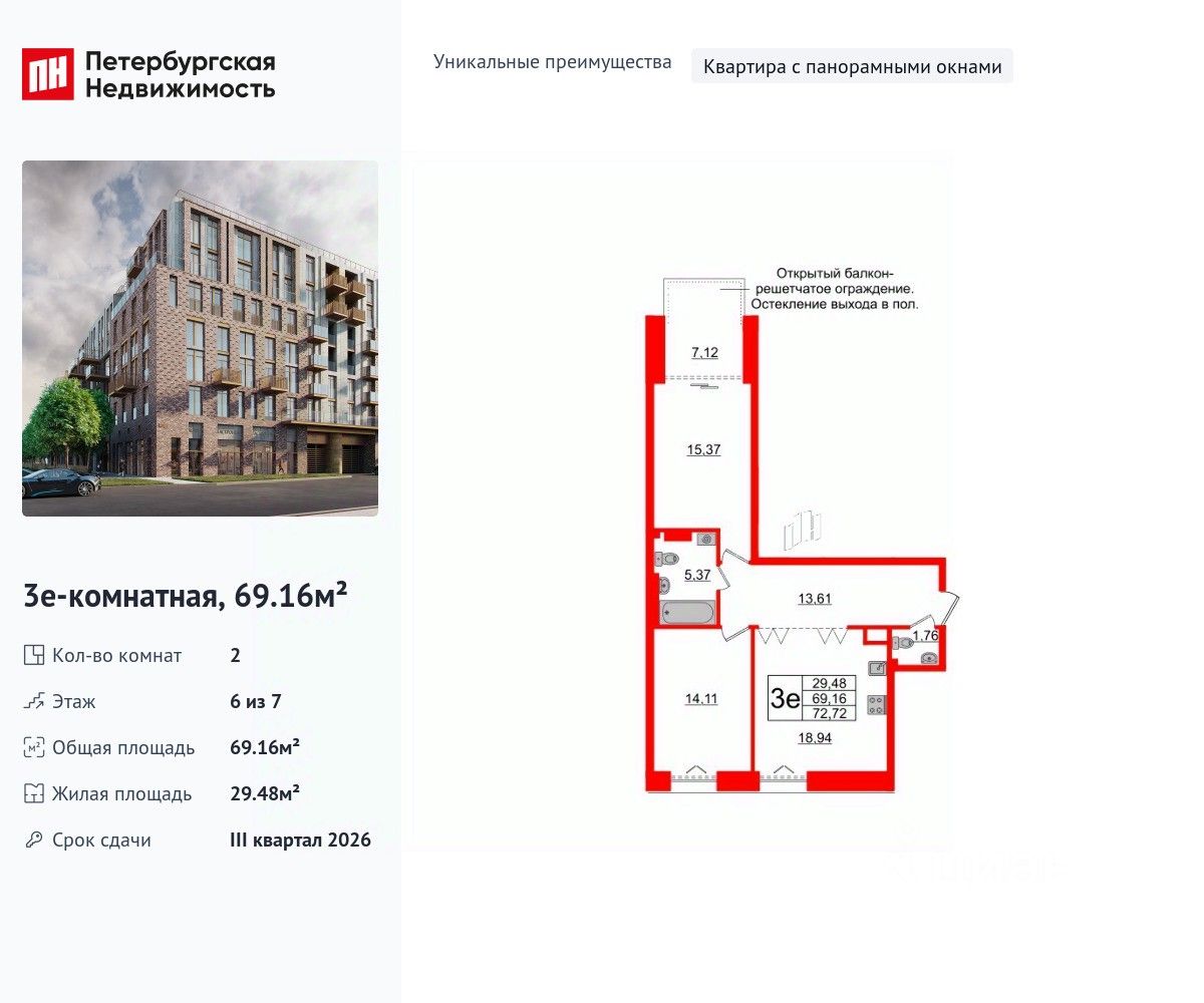 Уникальная, функциональная европланировка, большая кухня-гостиная 18.94 м², просторная прихожая 13.61 м². Общая площадь квартиры - 69.16 м², жилая 29.48 м², высота потолка 3 м.