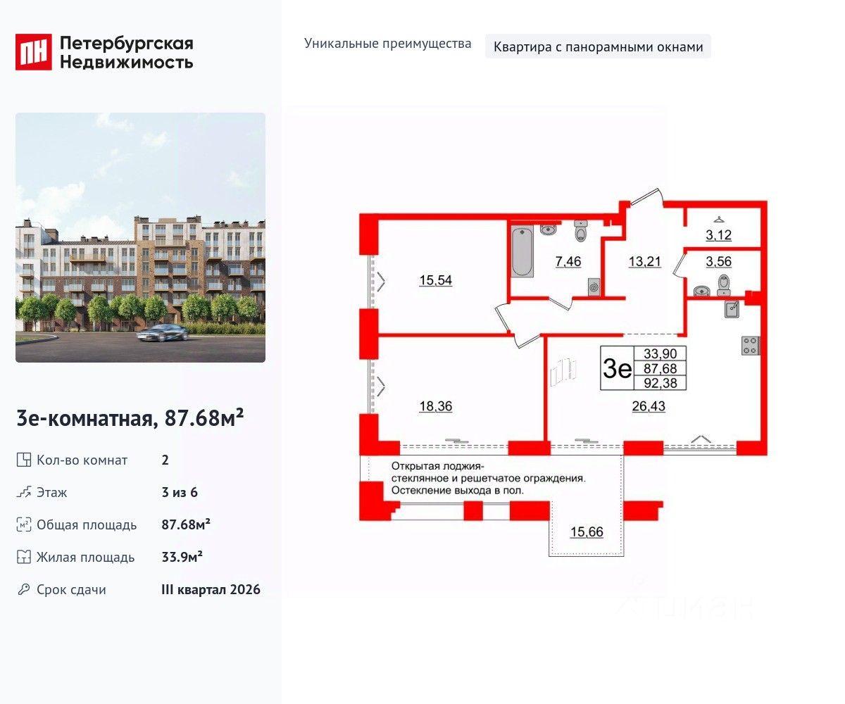 Уникальная, функциональная европланировка, большая кухня-гостиная 26.43 м², просторная прихожая 13.21 м². Общая площадь квартиры - 87.68 м², жилая 33.9 м², высота потолка 3 м.