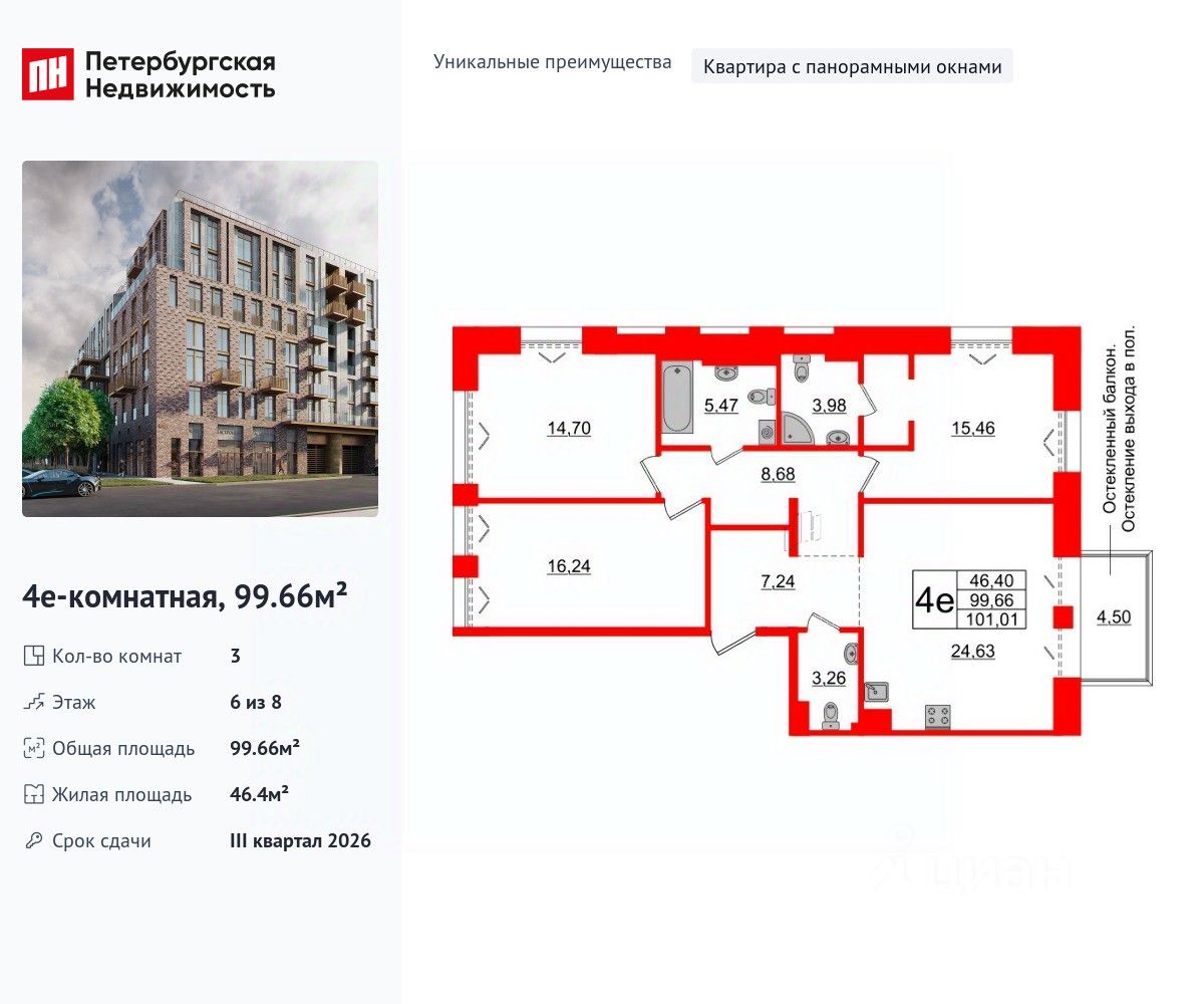Уникальная, функциональная европланировка, большая кухня-гостиная 24.63 м², вместительная прихожая 7.24 м². Общая площадь квартиры - 99.66 м², жилая 46.4 м², высота потолка 3 м.