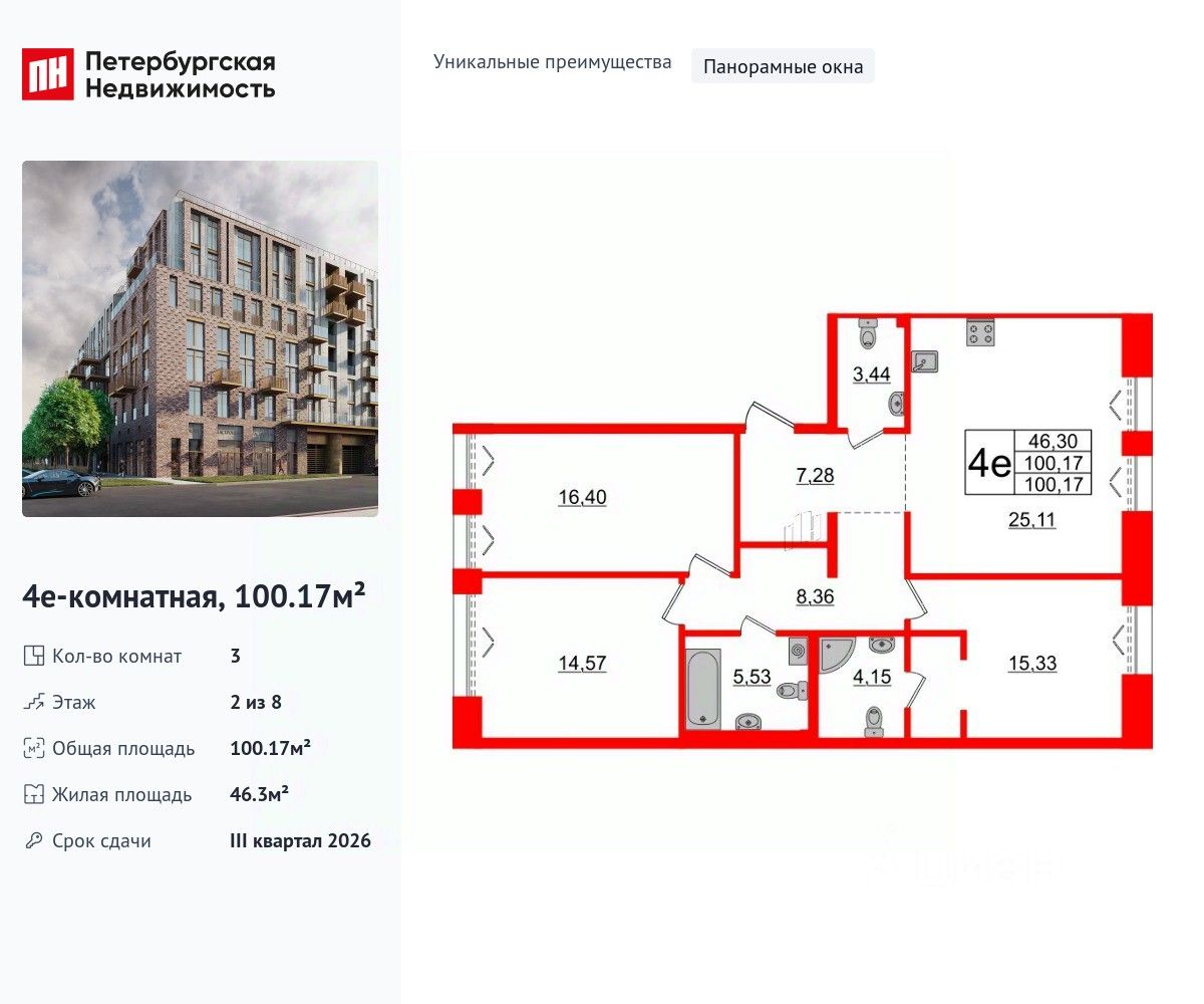 Уникальная, функциональная европланировка, большая кухня-гостиная 25.11 м², вместительная прихожая 7.28 м². Общая площадь квартиры - 100.17 м², жилая 46.3 м², высота потолка 3 м.