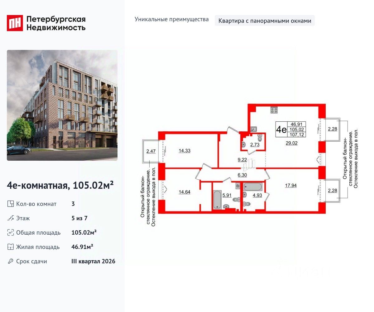 Уникальная, функциональная европланировка, большая кухня-гостиная 29.02 м², вместительная прихожая 9.22 м². Общая площадь квартиры - 105.02 м², жилая 46.91 м², высота потолка 3 м.