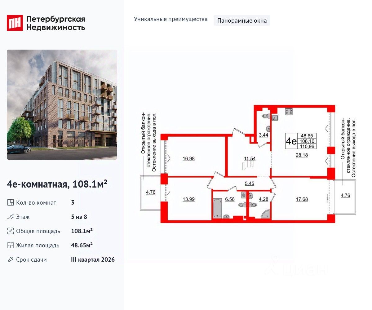 Уникальная, функциональная европланировка, большая кухня-гостиная 28.18 м², вместительная прихожая 11.54 м². Общая площадь квартиры - 108.1 м², жилая 48.65 м², высота потолка 3 м.
