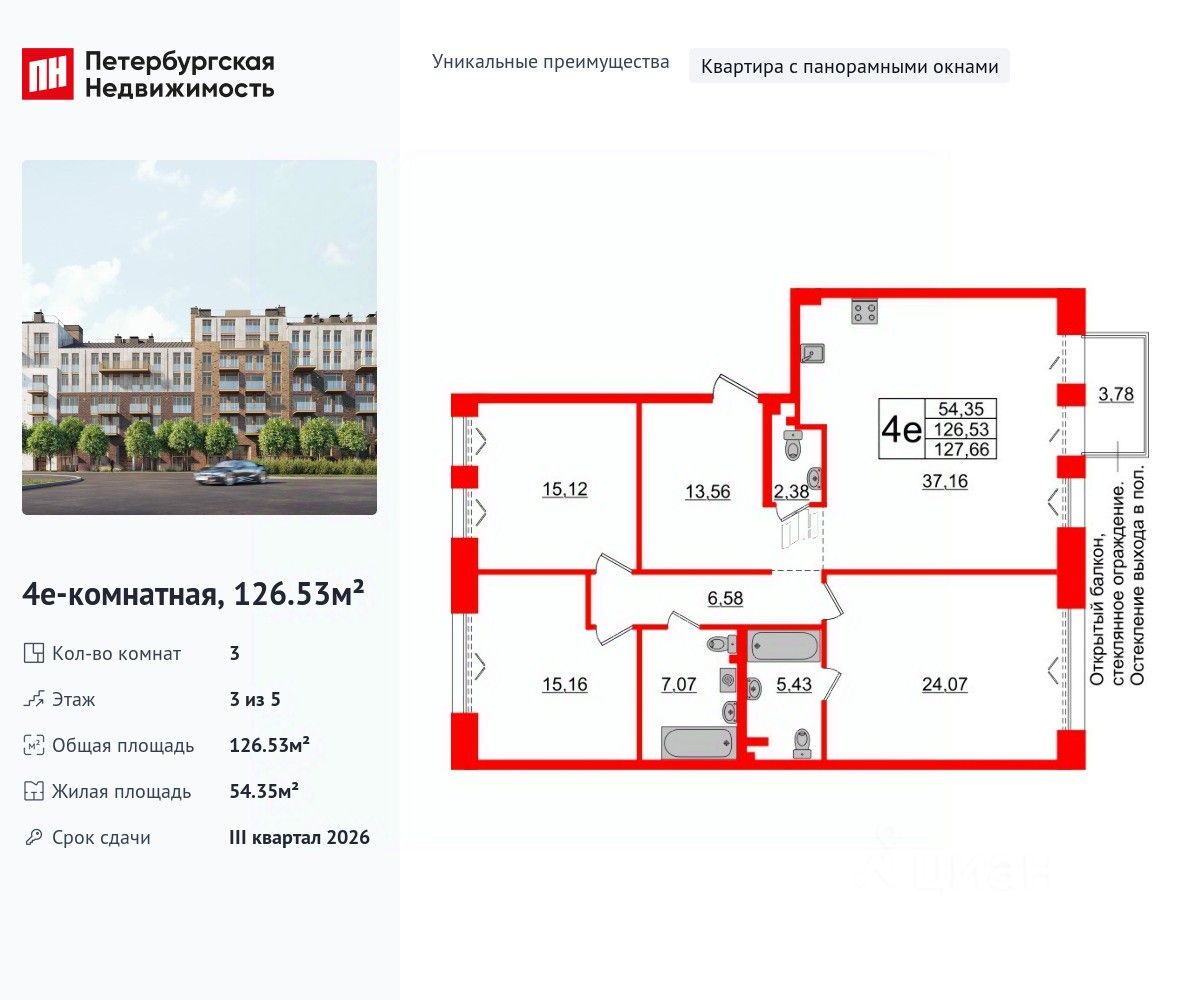 Уникальная, функциональная европланировка, большая кухня-гостиная 37.16 м², просторная прихожая 13.56 м². Общая площадь квартиры - 126.53 м², жилая 54.35 м², высота потолка 3 м.