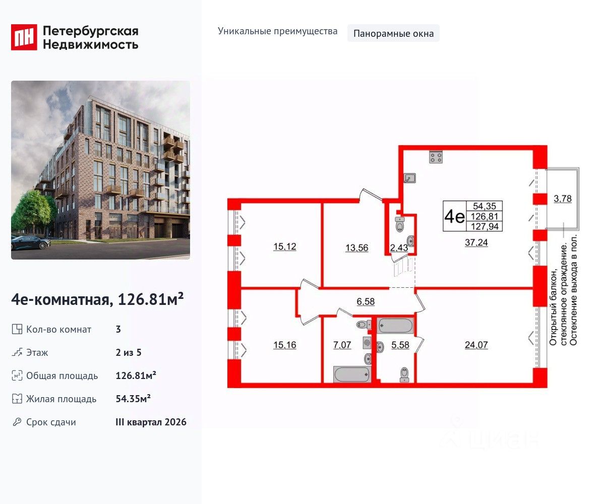 Уникальная, функциональная европланировка, большая кухня-гостиная 37.24 м², просторная прихожая 13.56 м². Общая площадь квартиры - 126.81 м², жилая 54.35 м², высота потолка 3 м.