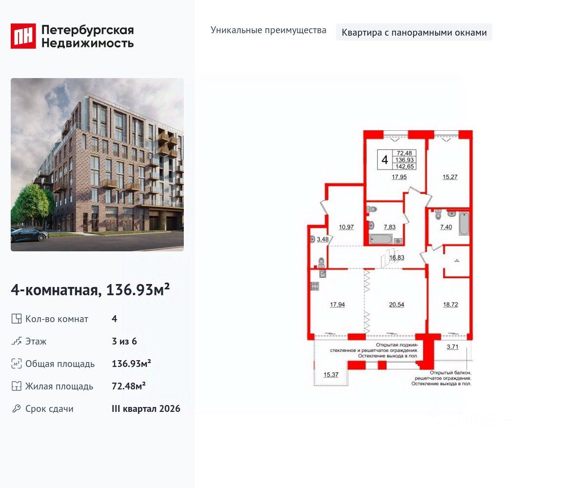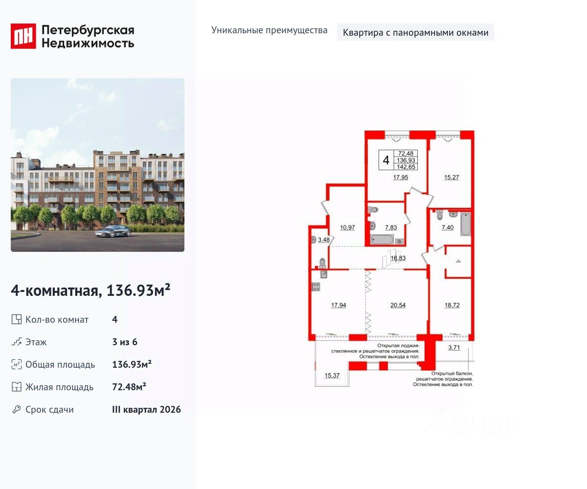 Уникальная планировка, кухня 17.94 м², просторная прихожая 10.97 м². Общая площадь квартиры - 136.93 м², жилая 72.48 м², высота потолка 3 м.
