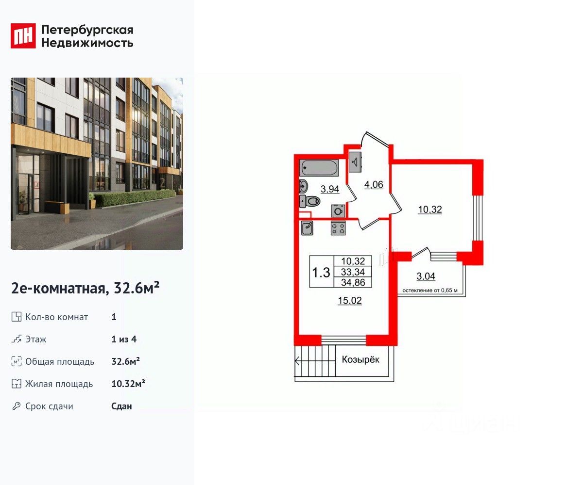 Удобная, классическая, функциональная европланировка, большая кухня-гостиная 15.02 м², вместительная прихожая 4.06 м². Общая площадь квартиры - 32.6 м², жилая 10.32 м², высота потолка 2.77 м.