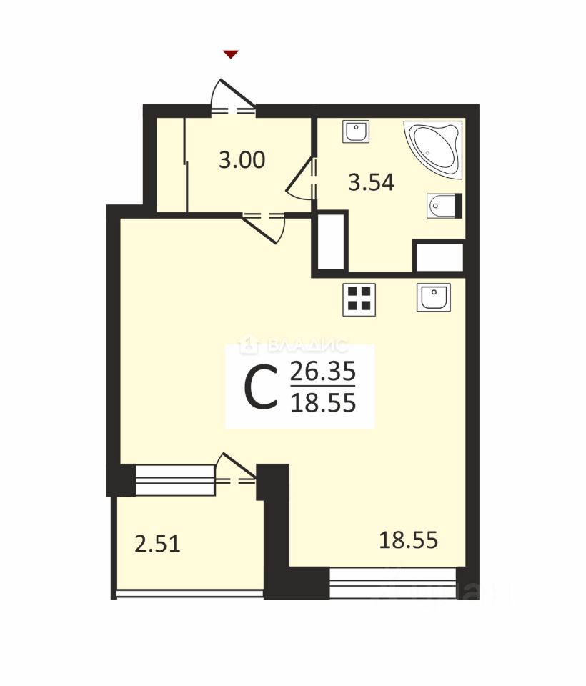 - Площадь и планировка: общая площадь квартиры составляет 25,09 кв. м, жилая — 18,55 кв. м. Высота потолков 2,8 м создаёт ощущение простора. Угловая планировка обеспечивает хорошую освещённость.