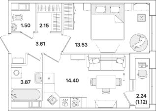 Квартира находится в 12 этажном доме, в Академик Жилой дом 3 на 5 этаже. Общая площадь квартиры 40,18 кв.м.