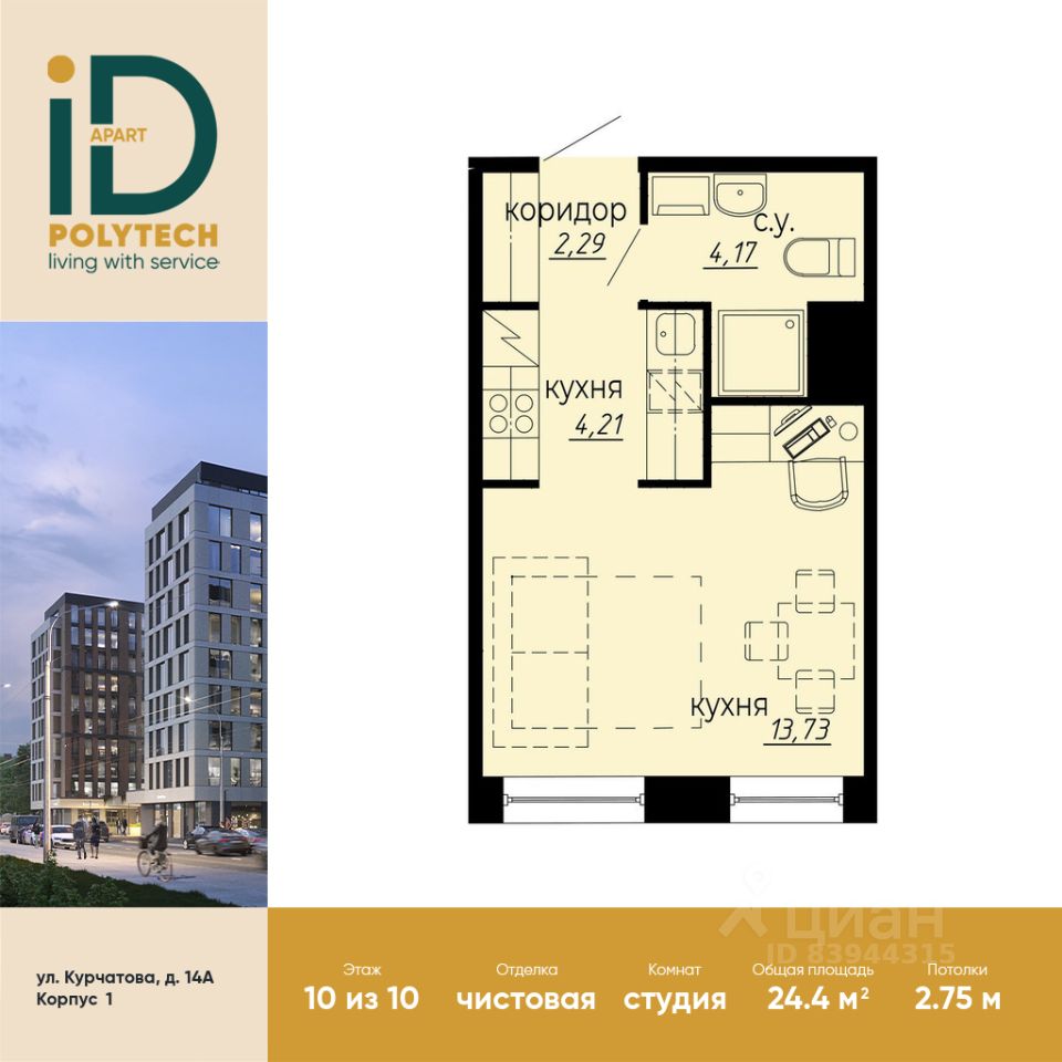 В продаже стильная эргономичная студия с готовой отделкой в эксклюзивном апарт-комплексе iD Polytech.