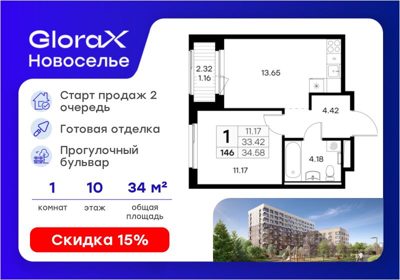 Продается 1-комн. квартира на 10-м этаже в строящемся проекте комфорт-класса GloraX Новоселье. Общая площадь лота составляет 34,58 кв. м, из которых 11,17 кв. м отведено под жилую и 13,65 кв. м под кухонную зону. Номер квартиры - 146