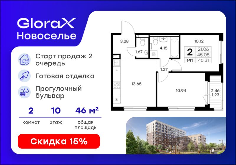 Продается 2-комн. квартира на 10-м этаже в строящемся проекте комфорт-класса GloraX Новоселье. Общая площадь лота составляет 46,31 кв. м, из которых 21,06 кв. м отведено под жилую и 13,65 кв. м под кухонную зону. Номер квартиры - 141