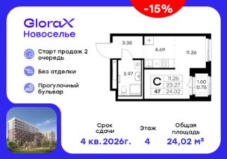 Продается квартира-студия на 4-м этаже в строящемся проекте комфорт-класса GloraX Новоселье. Общая площадь лота составляет 24,02 кв. м, из которых 11,26 кв. м отведено под жилую и 4,69 кв. м под кухонную зону. Номер квартиры - 47