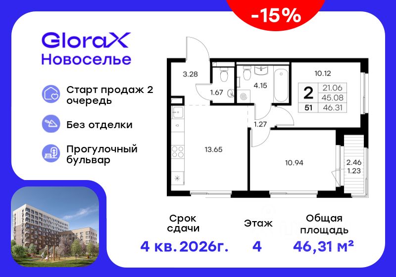Продается 2-комн. квартира на 4-м этаже в строящемся проекте комфорт-класса GloraX Новоселье. Общая площадь лота составляет 46,31 кв. м, из которых 21,06 кв. м отведено под жилую и 13,65 кв. м под кухонную зону. Номер квартиры - 51