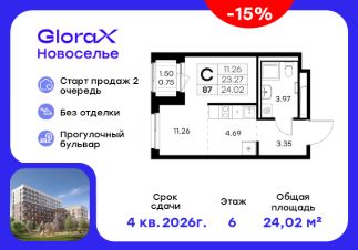 Продается квартира-студия на 6-м этаже в строящемся проекте комфорт-класса GloraX Новоселье. Общая площадь лота составляет 24,02 кв. м, из которых 11,26 кв. м отведено под жилую и 4,69 кв. м под кухонную зону. Номер квартиры - 87