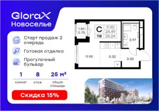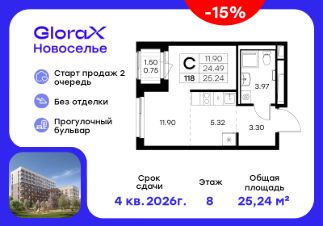 Продается квартира-студия на 8-м этаже в строящемся проекте комфорт-класса GloraX Новоселье. Общая площадь лота составляет 25,24 кв. м, из которых 11,90 кв. м отведено под жилую и 5,32 кв. м под кухонную зону. Номер квартиры - 118