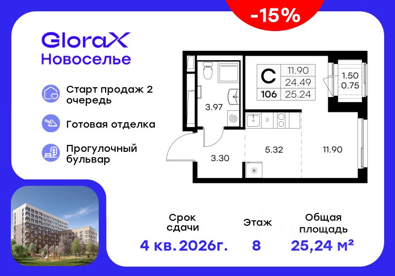 Продается квартира-студия на 8-м этаже в строящемся проекте комфорт-класса GloraX Новоселье. Общая площадь лота составляет 25,24 кв. м, из которых 11,90 кв. м отведено под жилую и 5,32 кв. м под кухонную зону. Номер квартиры - 106