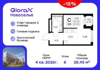 Продается квартира-студия на 8-м этаже в строящемся проекте комфорт-класса GloraX Новоселье. Общая площадь лота составляет 25,95 кв. м, из которых 11,88 кв. м отведено под жилую и 5,34 кв. м под кухонную зону. Номер квартиры - 109