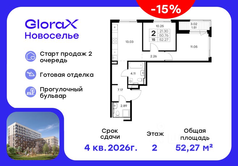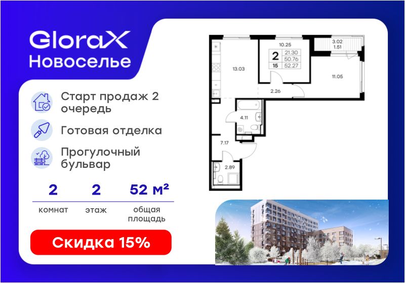 Продается 2-комн. квартира на 2-м этаже в строящемся проекте комфорт-класса GloraX Новоселье. Общая площадь лота составляет 52,27 кв. м, из которых 21,30 кв. м отведено под жилую и 13,03 кв. м под кухонную зону. Номер квартиры - 15
