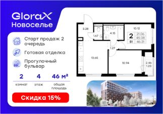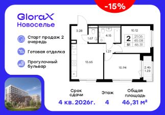 Продается 2-комн. квартира на 4-м этаже в строящемся проекте комфорт-класса GloraX Новоселье. Общая площадь лота составляет 46,31 кв. м, из которых 21,06 кв. м отведено под жилую и 13,65 кв. м под кухонную зону. Номер квартиры - 51