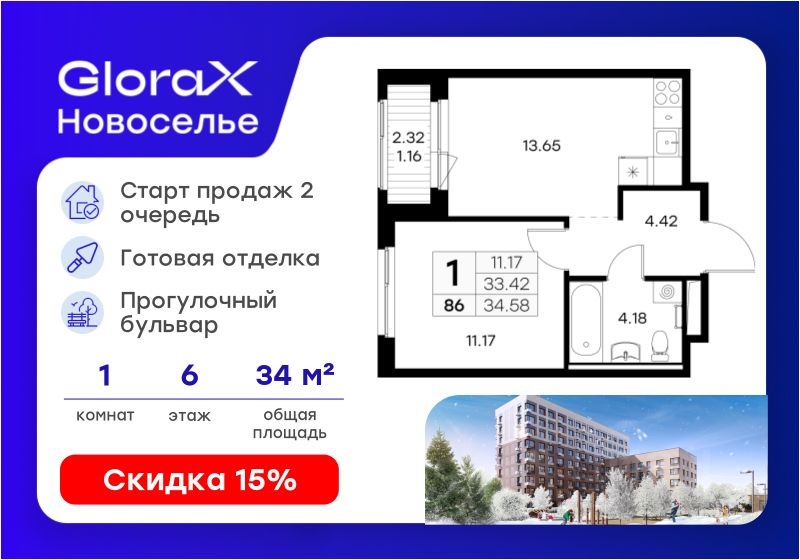 Продается 1-комн. квартира на 6-м этаже в строящемся проекте комфорт-класса GloraX Новоселье. Общая площадь лота составляет 34,58 кв. м, из которых 11,17 кв. м отведено под жилую и 13,65 кв. м под кухонную зону. Номер квартиры - 86