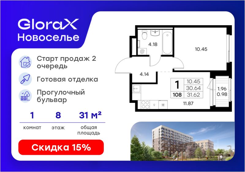 Продается 1-комн. квартира на 8-м этаже в строящемся проекте комфорт-класса GloraX Новоселье. Общая площадь лота составляет 31,62 кв. м, из которых 10,45 кв. м отведено под жилую и 11,87 кв. м под кухонную зону. Номер квартиры - 108