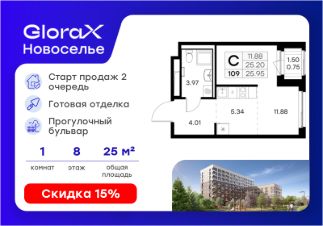 Продается квартира-студия на 8-м этаже в строящемся проекте комфорт-класса GloraX Новоселье. Общая площадь лота составляет 25,95 кв. м, из которых 11,88 кв. м отведено под жилую и 5,34 кв. м под кухонную зону. Номер квартиры - 109