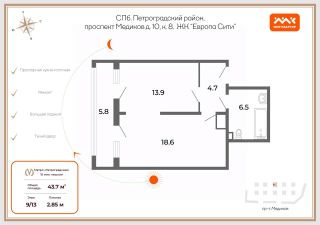 Корпус, в котором находится квартира, расположен в глубине территории комплекса, что гарантирует полное отсутствие шума с проспекта Медиков.
