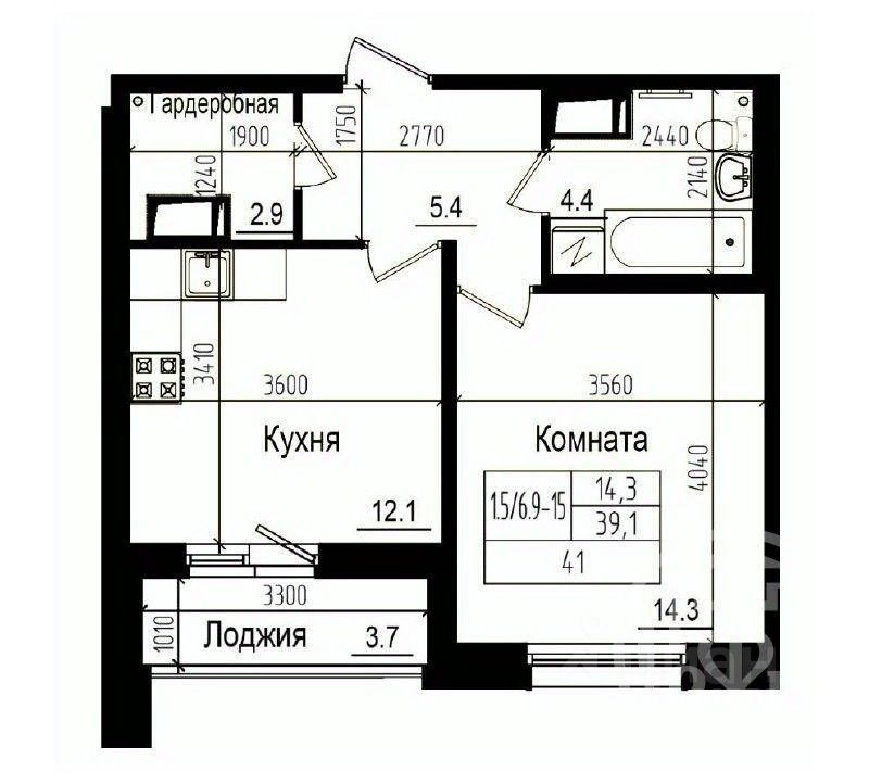 планировка. Просторная кухня - 12.1 м², функциональная прихожая - 5.4 м² вместе с удобной гардеробной - 2.9 м². Общая площадь квартиры - 39.1 м², жилая 14.3 м², высота потолка 2.75 м.