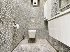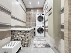 Санузлы раздельные, оба оснащены водонагревателями — удобно для семьи. В совмещенном санузле две раковины, стиральная и сушильная машины Bosch.