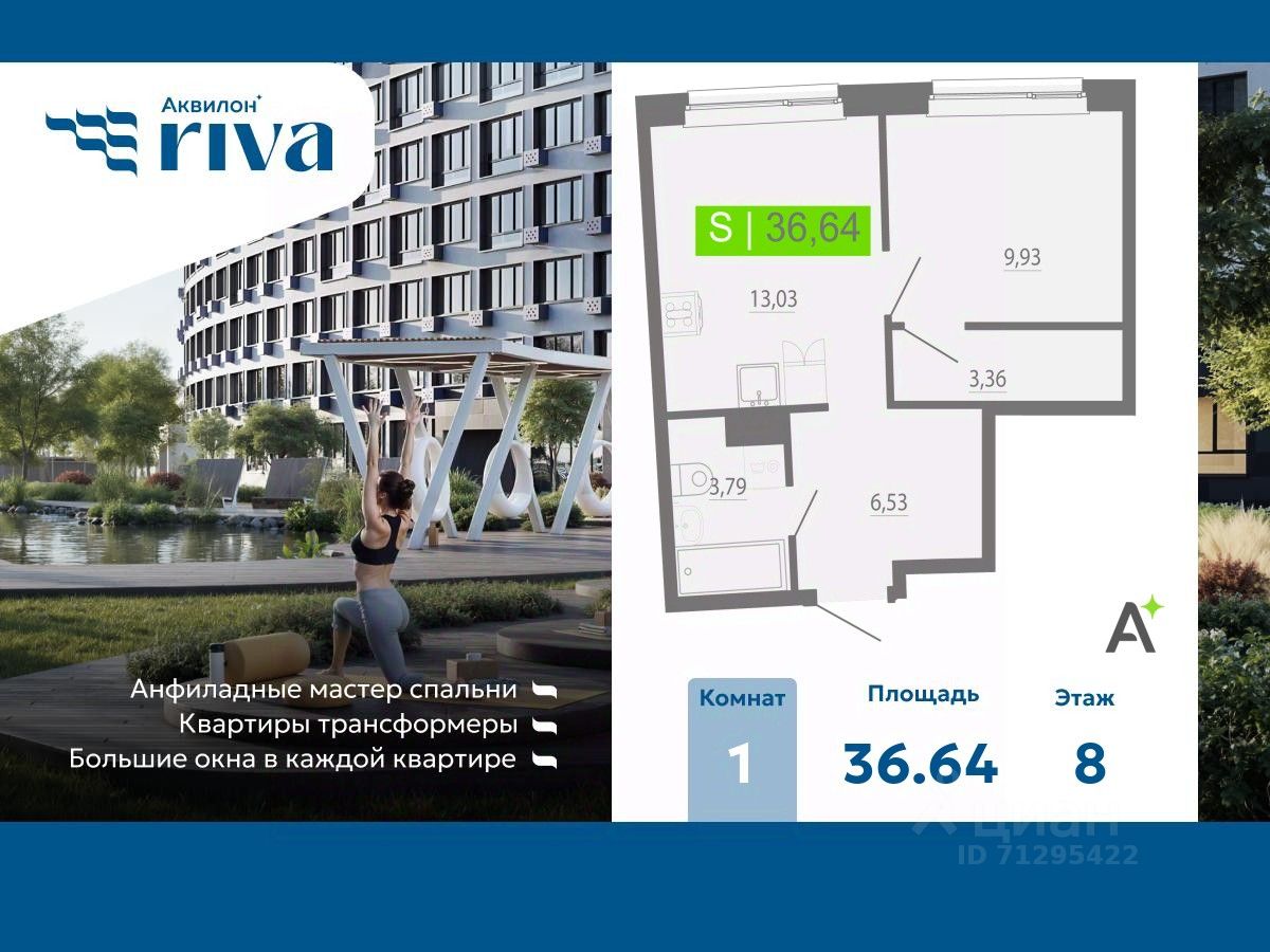 Просторная 1-комн. квартира в ЖК "Аквилон RIVA" на 8 этаже. Квартира без отделки, после оформления собственности можно делать ремонт. Общая площадь: 36.64 кв.м., площадь просторной кухни-столовой: 13.03 кв.м. Высота потолков 2.73 м.