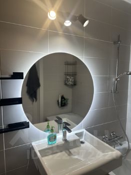 В ванне установлена акриловая ванна, навесная раковина, под которую удобно установить стиральную машину для экономии места. Зеркало с подсветкой, качественный унитаз.