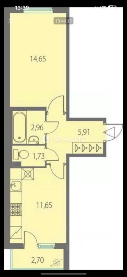 Квартира расположена на четвёртом этаже кирпично-монолитного дома, построенного в 2021 году. Общая площадь — 39 кв. м, из которых 15 кв. м приходится на жилую площадь, а 12 кв. м — на кухню. Балкон и окна, выходящие на улицу, добавляют пространству света и воздуха.