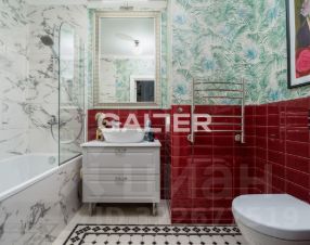 - ванная комната в кафельной плитке с дизайнерскими обоями, оснащена вместительной ванной, инсталляцией и теплом полом,